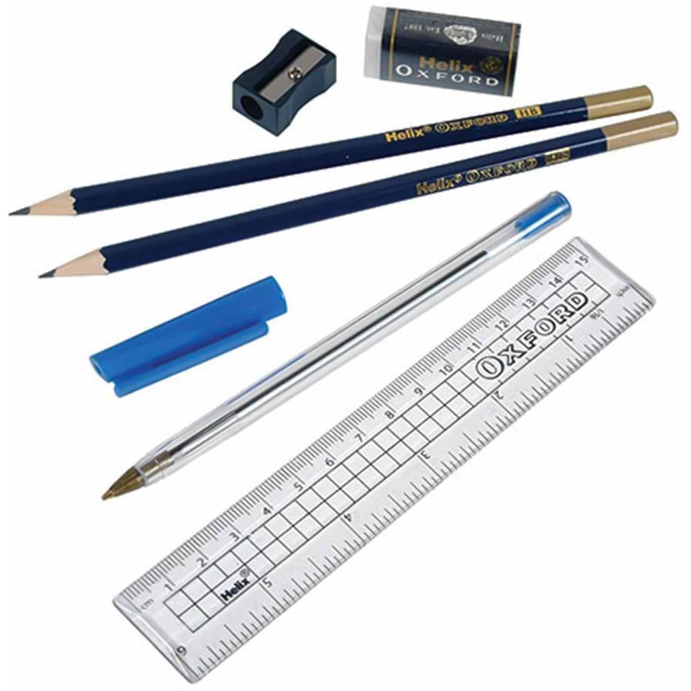 - Includes single hole pencil sharpener with anti tamper screw, ballpoint pen with ergonomic grip and a 15cm ruler with metric graduations, all made from recycled plastic